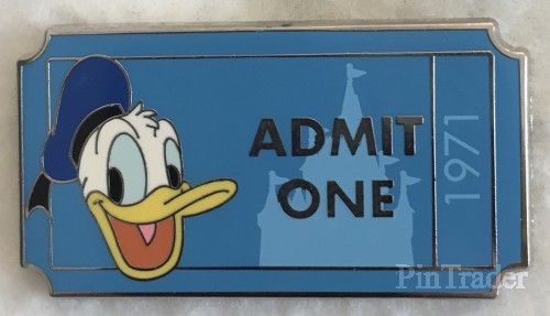 | This pin is part of the Admission Ticket 'pin with purchase' and features Donald's head and reads "admit one" and has Cinderella's Castle amidst a blue background. The year 1971 appears on the ticket, which is the year Walt Disney World opened. |