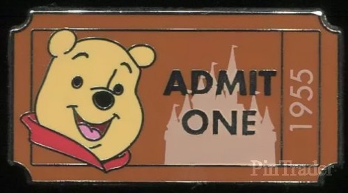 | This pin is part of the Admission Ticket 'pin with purchase' and features Winnie the Pooh’s head and reads "admit one" and has Sleeping Beauty Castle amidst a brown background. The year 1955 appears on the ticket, which is the year Disneyland opened. |