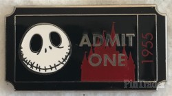 | This pin is part of the Admission Ticket 'pin with purchase' and features Jack Skellington’s head and reads "admit one" and has Sleeping Beauty Castle amidst a black background. The year 1955 appears on the ticket, which is the year Disneyland opened. |