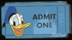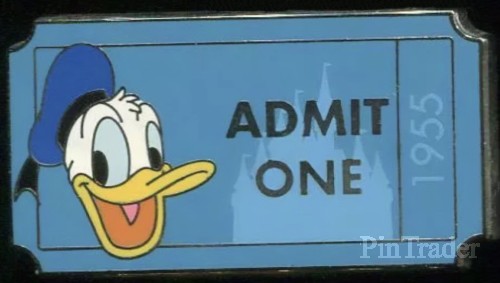 | This pin is part of the Admission Ticket 'pin with purchase' and features Donald Duck’s head and reads "admit one" and has Sleeping Beauty Castle amidst a blue background. The year 1955 appears on the ticket, which is the year Disneyland opened. |