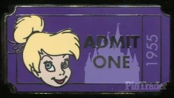 | This pin is part of the Admission Ticket 'pin with purchase' and features Tinker Bell’s head and reads "admit one" and has Sleeping Beauty Castle amidst a purple background. The year 1955 appears on the ticket, which is the year Disneyland opened. |