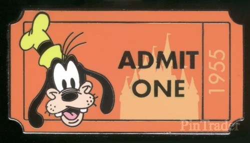 | This pin is part of the Admission Ticket 'pin with purchase' and features Goofy’s head and reads "admit one" and has Sleeping Beauty Castle amidst a orange background. The year 1955 appears on the ticket, which is the year Disneyland opened. |