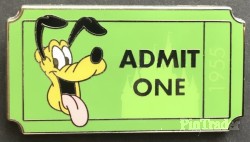 | This pin is part of the Admission Ticket 'pin with purchase' and features Pluto’s head and reads "admit one" and has Sleeping Beauty Castle amidst a green background. The year 1955 appears on the ticket, which is the year Disneyland opened. |