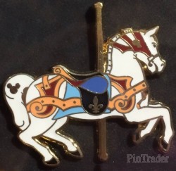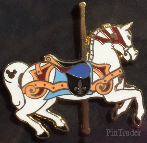 | This is one of eight hidden mickey pins, featuring the carousel horses on the King Arthur's Carousel ride in Fantasyland. This pin features a horse with a orange, black, blue, burgundy, and light blue saddle. The pole is gold. Based on the actual carousel horse named King. 4 of 8 |
