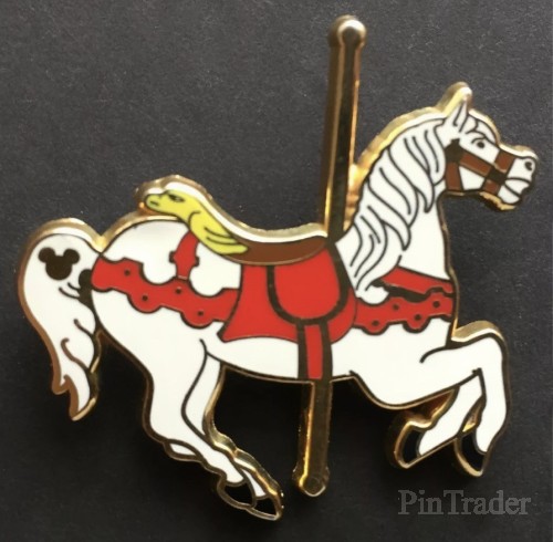 | This is one of eight hidden mickey pins, featuring the carousel horses on the King Arthur's Carousel ride in Fantasyland. This pin features a horse with scalloped, red saddle straps carved across his shoulders and flanks. Based on the actual carousel horse named Looff. 7 of 8 |