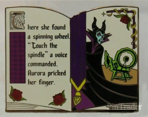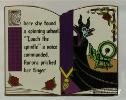 | 2 pins per box. The pin is in the shape of an open book. On the right side of the book/pin, Maleficent is standing at the spinning wheel. The left side of the book/pin reads "There she found a spinning wheel. "Touch the spindle" a voice commanded. Aurora pricked her finger." Pins release first at the Disneyland Resort Pin Trading Night / Event on February 21, 2019, before releasing at the Walt Disney World Pin Trading Night / Event on February 28, 2019. |