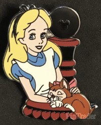 | This pin features Alice in front of a pawn chess piece which is red & black . She has her cat Dinah in her hands |