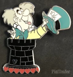 | This pin features The Mad Hatter appearing from the top of a castle chess piece in red & black. |