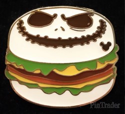 | This game pin was release during the Pin Trading Carnival in Hong Kong Disneyland in March 2018. This pin features Jack Skellington from the movie Nightmare Before Christmas in the shape of a hamburger. His head is printed in the upper sandwich that’s all white and has an hidden mickey logo on his left cheek. Below that you can see lettuce and cheese stick out. The bottom sandwich is also white. These pins could only be won by playing games during the Pin Trading Carnival, and could not be bought. The complete set of 12 pins could be collected and placed on a card thats in the shape of dinner cart. The back of the pin has the FAC code 020070-17349 and shows the text Hidden Mickey pin series 6 of 12 |