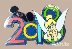 | 2 pins per box. Tinkerbell leaning in the "8" of 2018 , there are Mickey-ears on the "2" . 2018 is in the colours red yellow blue and green . |