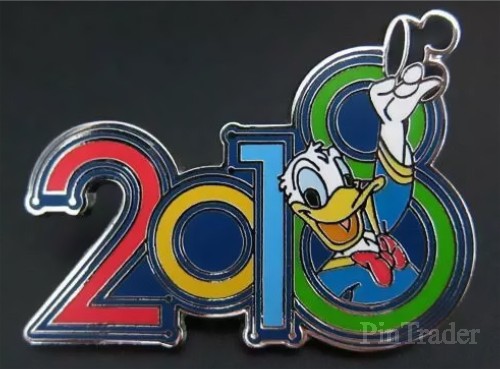 | 2 pins per box. Donald Duck is in the "8" of 2018 , He is holding Mickey-ears . 2018 is in the colours red yellow blue and green . |