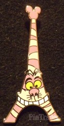 | A series of pins shaped like the Eiffel Tower. This pin features the Cheshire Cat's face and his colors. The top of the tower is shaped like a mickey head. |