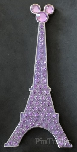 | A series of pins shaped like the Eiffel Tower. This pin features purple rhinestones. The top of the tower is shaped like a mickey head |