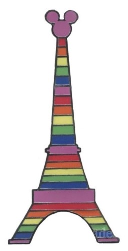 | A series of pins shaped like the Eiffel Tower. This pin features rainbow stripes. The top of the tower is shaped like a mickey head |