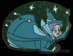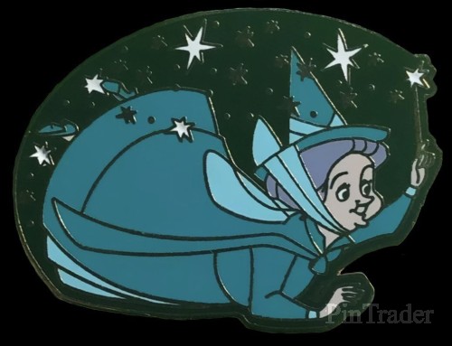 | This pin is of Fauna a fairy from "Sleeping Beauty." She is flying around facing to the right. She is wearing her green robe and has her wand raised emitting "fairy dust" as she goes. Pin 1 of 4 in the series. This pin does NOT have a hidden mickey icon. A variant of this pin has a blue cape. |