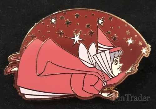 | This pin is of Flora a fairy from "Sleeping Beauty." She is flying around facing to the right. She is wearing her pink dress. She has her wand raised emitting "fairy dust" above her as she goes. Pin 3 of 4 in the series. This pin does NOT have a hidden mickey icon. A variant of this pin has an orange dress with a red cape. |