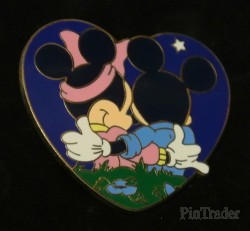 | This pin is a dark blue heart with Mickey and Minnie Mouse inside. Mickey and Minnie are sitting with their backs to us holding each other while looking up at a star. Pin 2 of 3 in the series. Re-released in the Hidden Mickey 2007 WDW releases in silver metal with a hidden Mickey icon. |