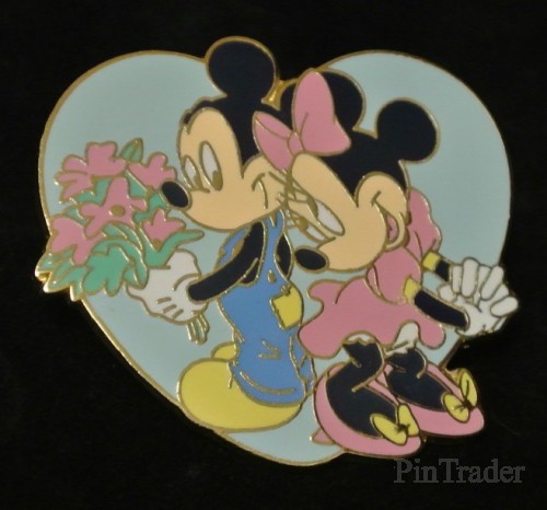 | This pin is a blue heart with Mickey and Minnie Mouse inside. Mickey is holding flowers ready to give to Minnie. Pin 1 of 3 in the series. Re-released in the Hidden Mickey 2007 WDW releases in silver metal with a hidden Mickey icon. |