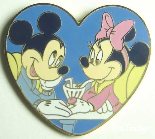 | This pin is a blue heart with Mickey and Minnie Mouse inside. Mickey and Minnie are sharing a drink. Pin 3 of 3 in the series. Re-released in the Hidden Mickey 2007 WDW releases in silver metal with a hidden Mickey icon. |