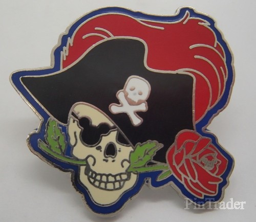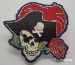 | This pin features a skull wearing a black pirate hat with a red feather holding a red rose between its teeth. |