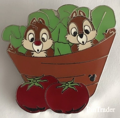 | A series of 6 pins released featuring Chip and Dale with fruit or vegetables. This pin depicts Chip and Dale sitting in a bowl of lettuce with tomatoes on the side. |