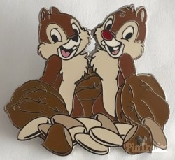 | A series of 6 pins released featuring Chip and Dale with fruit or vegetables. This pin depicts Chip and Dale with walnuts, acorns, and almonds. |