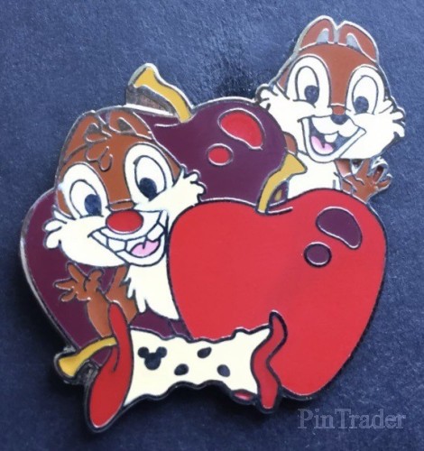 | A series of 6 pins released featuring Chip and Dale with fruit or vegetables. This pin depicts Chip and Dale with two apples. |