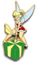 | Released in Disneyland Paris for Christmas of 2010 this is the Tinker Bell pin only from the four pin set. Tink is trying to open a green present with a yellow ribbon. She is wearing a red & white Santa dress with a red and green flower in her hair. The back has the 2010 ODPT logo, the DLP logo, ©Disney, Made in China on it. |