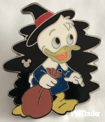 | Dewey, one of Donald Duck's nephews, is dressed up in a pilgrim costume and holding a trick or treat loot sack. His hat looks like a witch hat. |