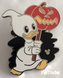 | Louie, one of Donald Duck's nephews, is dressed up in a ghost costume and holding a jack-o-lantern. |
