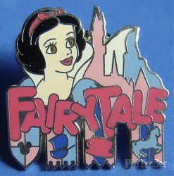 | This series of pins were given to guests checking in to three Disneyland resorts and were also available during Mickey's Pin Festival of Dreams. Each depicts a character and an associated word. This pin shows Snow White and a selection of banners for some of the fantasyland attractions and the silhouette of a castle. |
