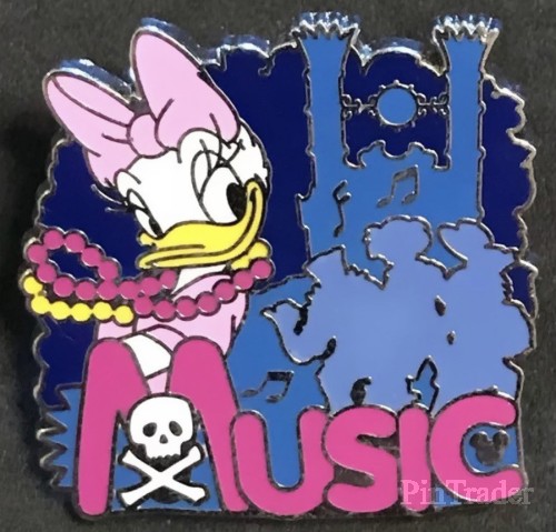 | This series of pins were given to guests checking in to three Disneyland resorts and were also available during Mickey's Pin Festival of Dreams. Each depicts a character and an associated word. This pin shows Daisy Duck alongside the silhouettes of the hitchhiking ghosts and the Mark Twain riverboat. She’s wearing Mardi Gras beads |