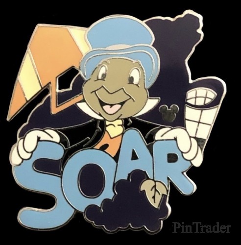 | This series of pins were given to guests checking in to three Disneyland resorts and were also available during Mickey's Pin Festival of Dreams. Each depicts a character and an associated word. This pin shows Jiminy Cricket along with a paraglider and the outline of bear mountain from DCA is in the background. |