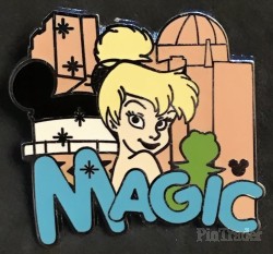 | This series of pins were given to guests checking in to three Disneyland resorts and were also available during Mickey's Pin Festival of Dreams. Each depicts a character and an associated word. This pin shows Tinker Bell in front of the Tower of Terror and the Earful Tower. |