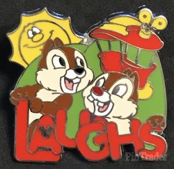 | This series of pins were given to guests checking in to three Disneyland resorts and were also available during Mickey's Pin Festival of Dreams. Each depicts a character and an associated word. This pin shows Chip & Dale in front of a Toontown trolley with a sun in the background. |
