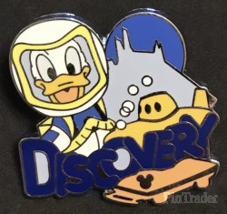 | This series of pins were given to guests checking in to three Disneyland resorts and were also available during Mickey's Pin Festival of Dreams. Each depicts a character and an associated word. This pin shows Donald Duck diving with a submarine. |