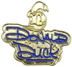 | This pin is gold with Donald Duck in the background and his signature in blue. |
