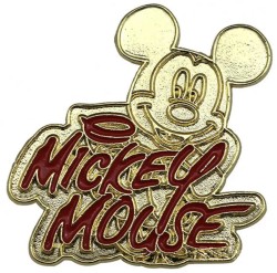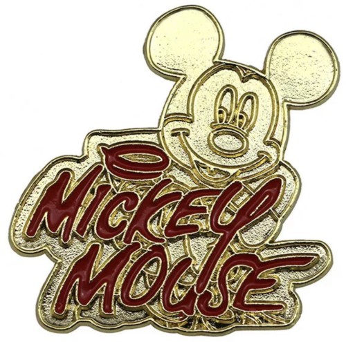 | This pin is gold with Mickey Mouse in the background and his signature in red. |