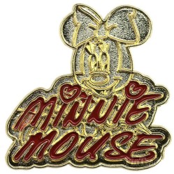 | This pin is gold with Minnie Mouse in the background and her signature in pink. |