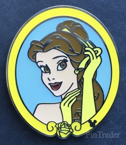 | This pin has Belle from "Beauty and the Beast" in a yellow colored oval frame with a light blue background. 2 of 5. Some versions of this pin do not have a hidden Mickey icon. |