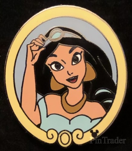 | This pin has Jasmine from "Aladdin" in a tan colored oval frame with a light blue background. 4 of 5. Some versions of this pin do not have a hidden Mickey icon. |