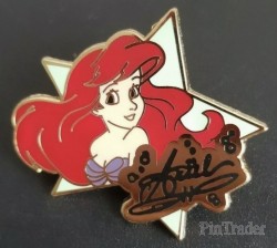 | Princess Ariel from The Little Mermaid poses in front of a light green star with her signature/autograph across the bottom in black on gold. |