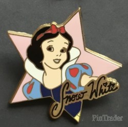 | Snow White poses in front of a pink star with her signature/autograph across the bottom in black on gold. |