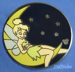 | This pin features Tinker Bell reclining on a crescent moon with a starry night behind her. |