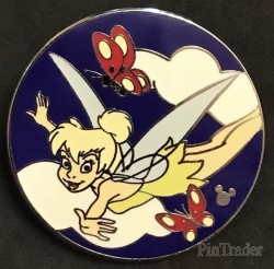 | This pin features Tinker Bell flying amongst the clouds with red butterflies beside her on a dark blue background. |