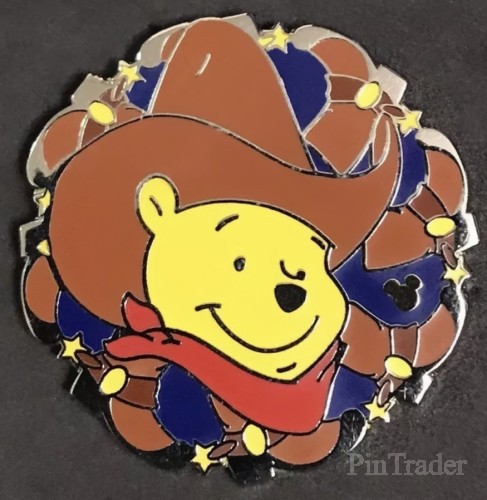 | Winnie the Pooh wears a cowboy hat and red kerchief with cowboy boots encircling him. |