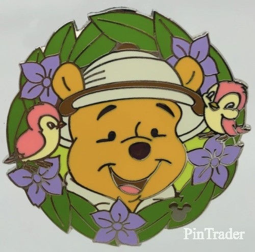 | Winnie the Pooh wears a Safari hat. He is encircled with green leaves, and purple flowers. A pink bird rests on either side of his head. |