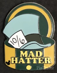 | Pin is a hat box with the hat of a Disney character inside. This pin is the Mad Hatter's light blue top hat. |