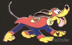 | Pluto is dressed in a red and blue superhero outfit with a red cape and mask. |