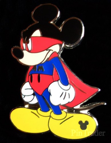 | Mickey Mouse is dressed in a red and blue superhero outfit with a red cape and mask. His hands are at his sides and he looks determined. |